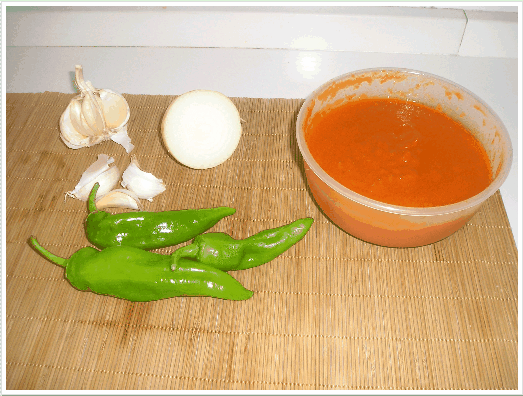 - 2 Pimientos. - 4 dientes de ajo. - Media cebolla- Tomate frito (puede ser natural o en conserva)