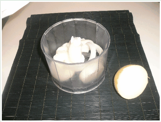 Vamos a empezar troceando los alimentos, primero la cebolla. Podemos hacerlo con la picadora o a mano.